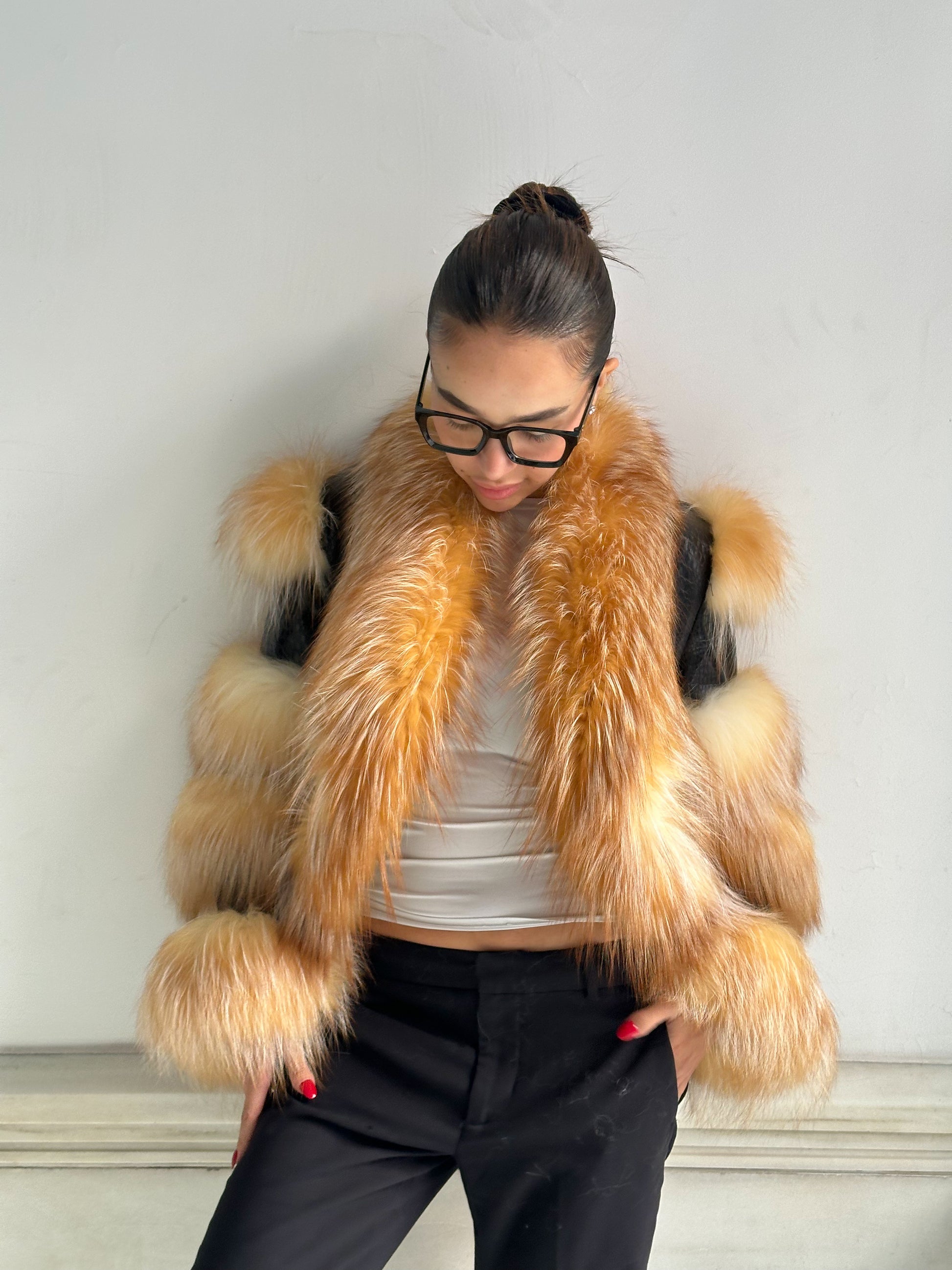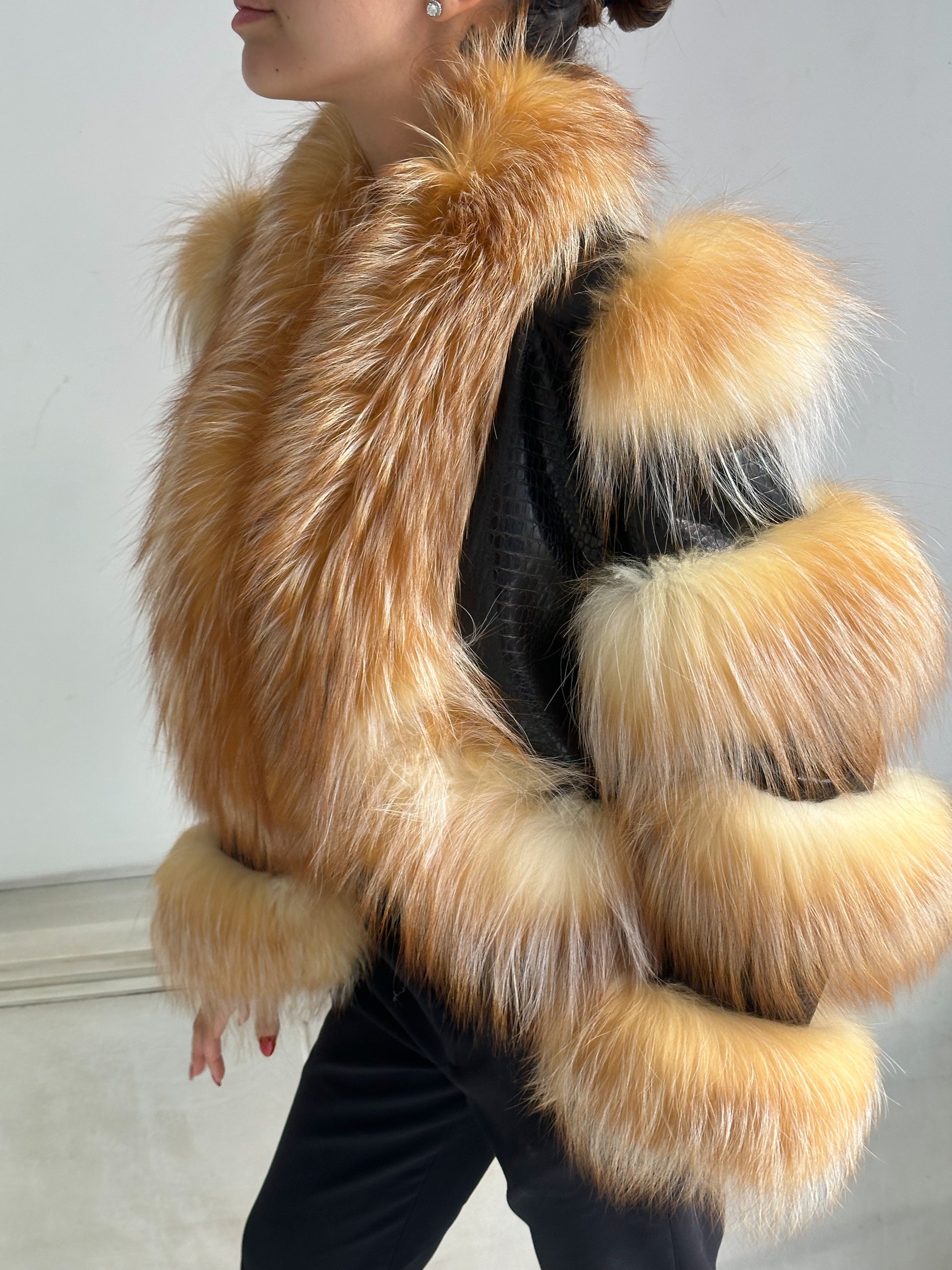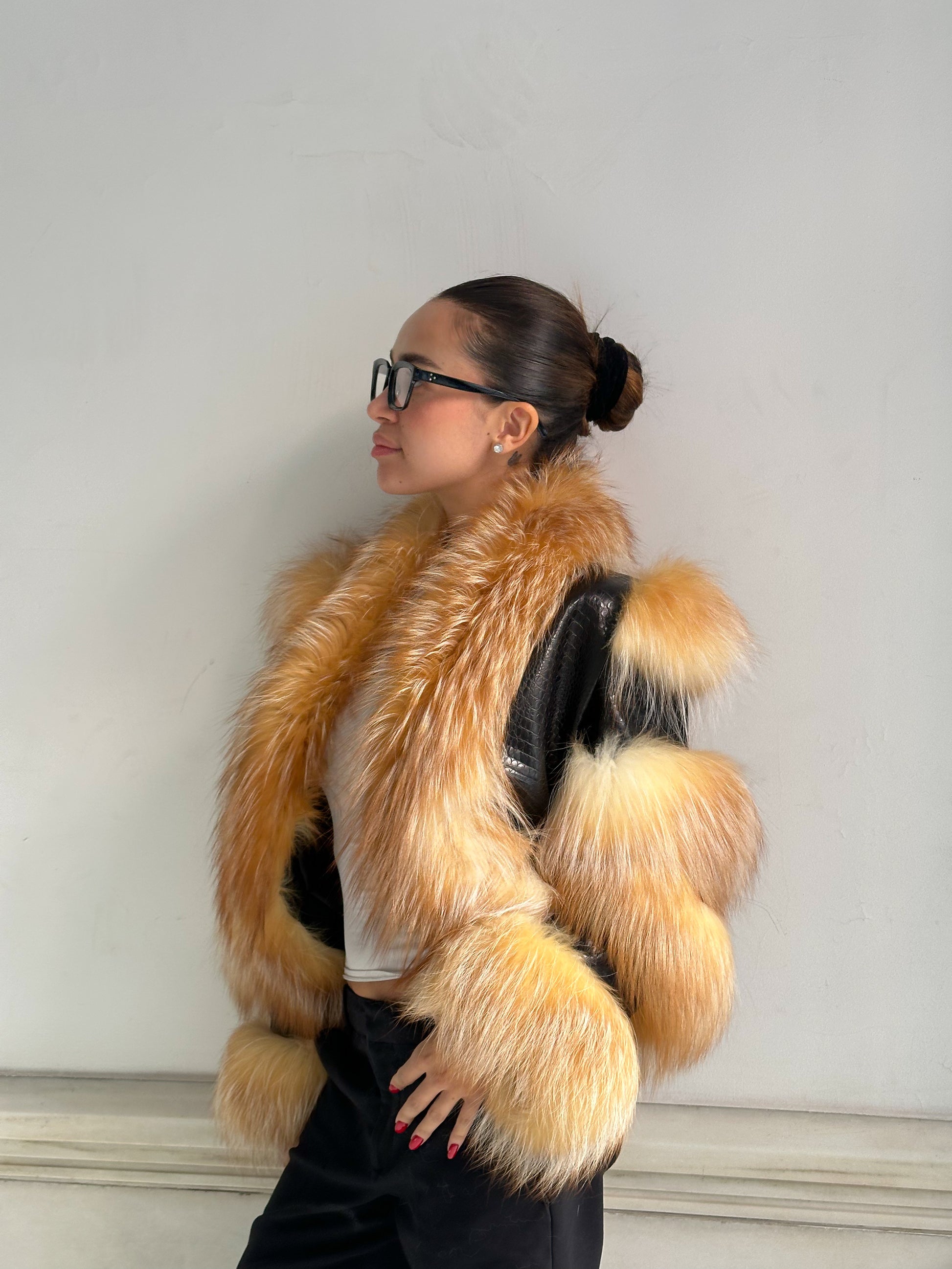 Un icono de nuestra colección, pensado para robar miradas y convertirse en el centro de todas las conversaciones. El abrigo GOSSIP combina cuero trabajado con paneles de piel natural en franjas voluptuosas que recorren mangas y bajos, creando un efecto arquitectónico y lujoso. El frente se viste de un espectacular pelo en tonos dorados y cálidos que aportan movimiento, suavidad y un aire teatral imposible de ignorar.